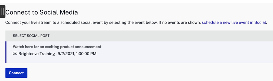 - Pour connecter un événement en direct à un événement social planifié à l'aide du module Live, cliquez sur Se connecter aux médias sociaux dans la navigation de gauche. Notez que l'événement en direct peut également être attribué à l'aide du module Social.