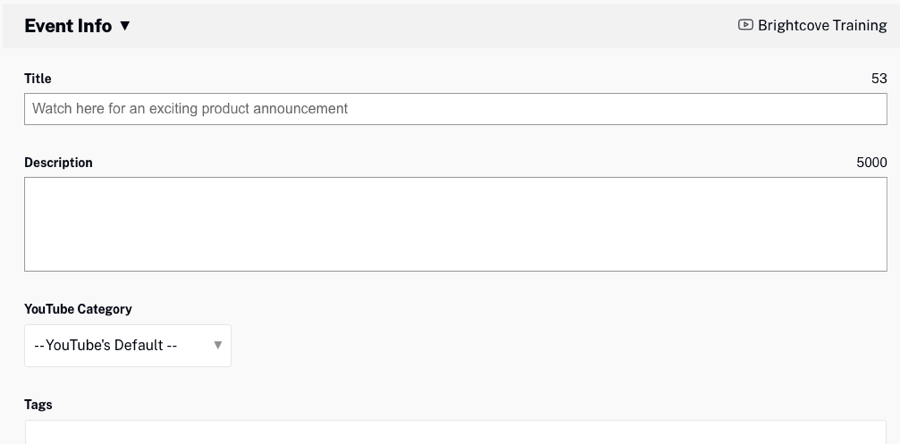 - Sur la page Planifier un événement en direct, saisissez un titre, une description et sélectionnez une catégorie YouTube. Ces valeurs apparaîtront dans votre message YouTube et dans le flux en direct.