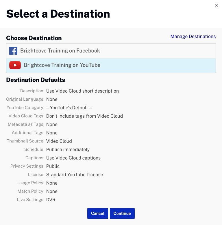 - Sélectionnez la destination vers laquelle l'événement sera diffusé en continu, puis cliquez sur .