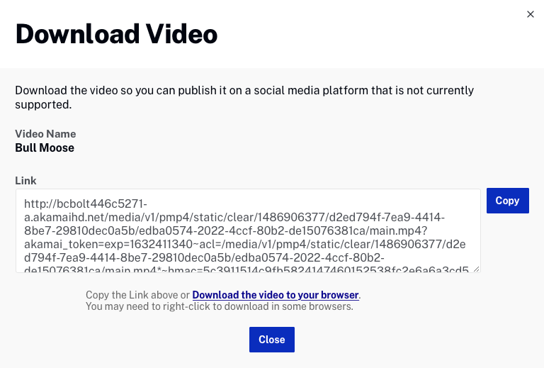 Brightcove Social permet de copier l'URL vidéo ou de télécharger un fichier source vidéo. Dans ce cas, le rendu MP4 de meilleure qualité sera téléchargé. S'il n'y a pas de rendus MP4, le Télécharger le lien sera désactivé.