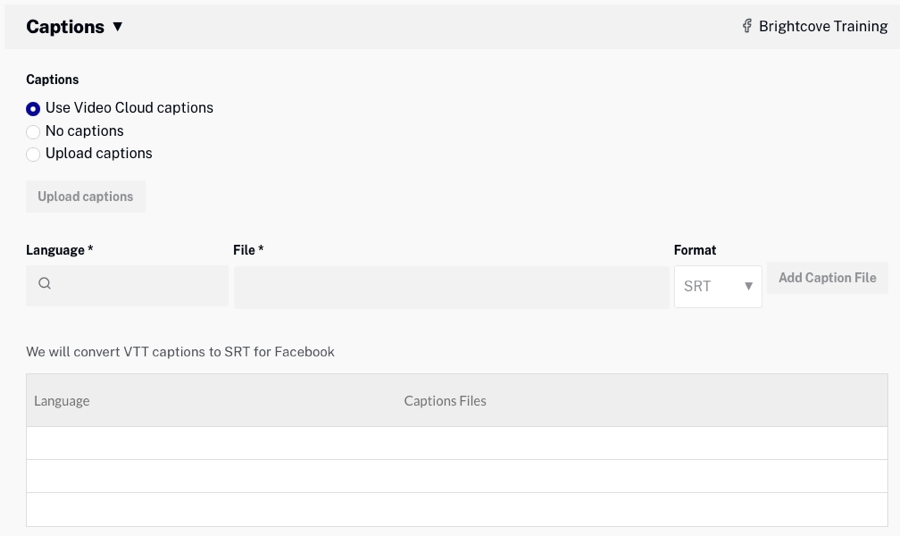 namesera visible pour les spectateurs dans le lecteur Facebook via le menu « Paramètres » et le menu « Sous-titres codés ». Nous recommandons que les étiquettes de piste de texte soient définies sur quelque chose qui sera significatif pour les utilisateurs. (Par exemple, étiqueter les légendes dans différentes langues dans ces langues.) - Aucun sous-titre : aucun sous-titre ne sera envoyé à YouTube