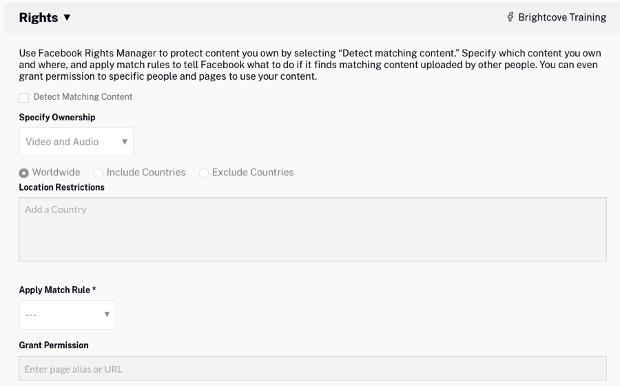 - Détecter le contenu correspondant : cochez cette option pour activer la gestion des droits Facebook. Pour plus d'informations, consultez la documentation Facebook.