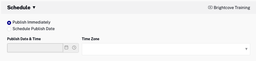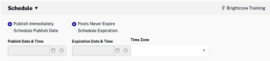 Cliquez sur le lien Schedule. Sélectionnez Publier immédiatement pour publier la vidéo immédiatement ou programmer la date de publication et sélectionnez Date et heure de publication. Vous pouvez également définir que les publications n'expirent jamais ou sélectionner Planifier l'expiration, puis sélectionner une date et une heure d'expiration. Un fuseau horaire peut également être sélectionné.