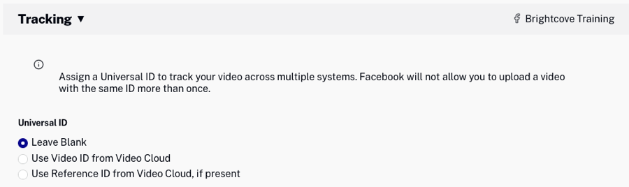Cliquez sur le lien Suivi pour attribuer un ID universel pour suivre la vidéo sur l'ensemble des systèmes. Les options d'ID universel suivantes sont disponibles :