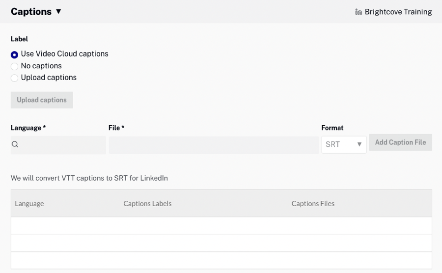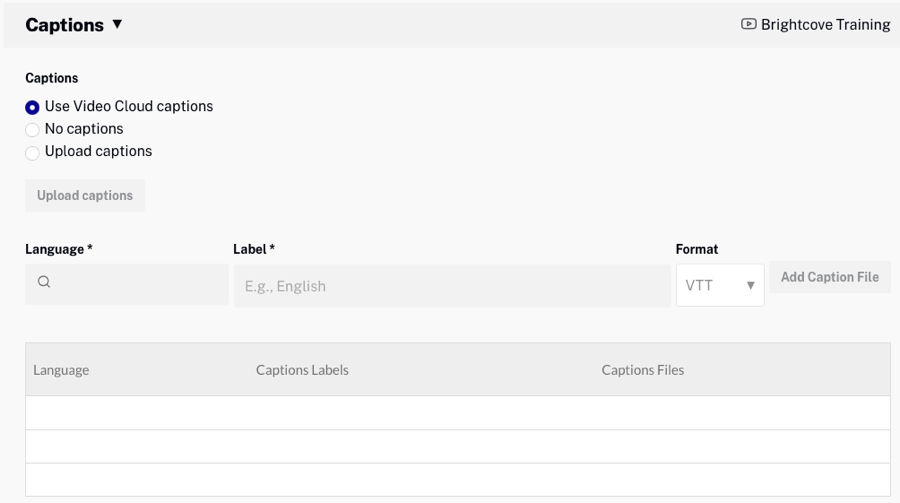 - Utiliser les sous-titres de Video Cloud : utilise les sous-titres associés à la vidéo. Pour plus d'informations sur l'utilisation des sous-titres, voir Présentation : Ajout de légendes à une vidéo.