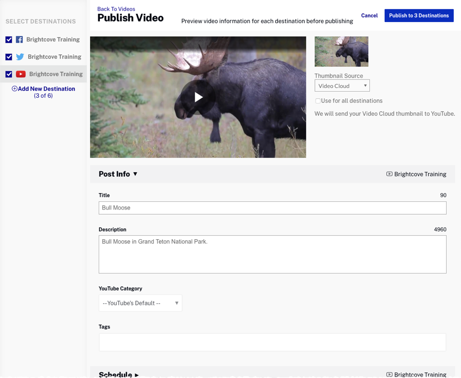 - Sélectionnez la ou les destinations de publication de la vidéo. Vous pouvez également cliquer sur Ajouter une nouvelle destination pour créer une nouvelle destination.