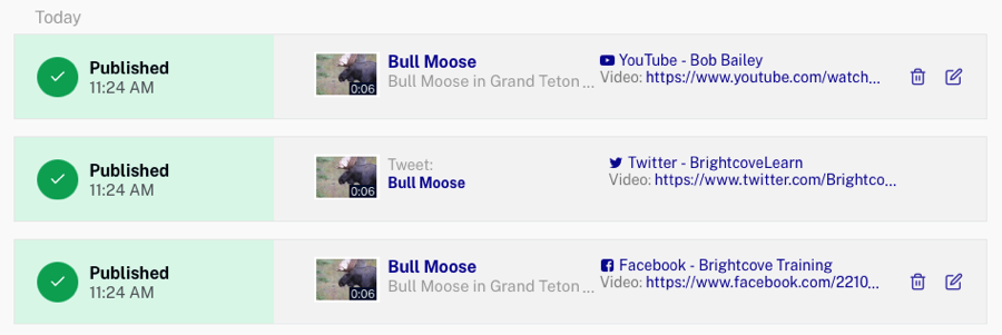 - Cliquez sur le bouton pour publier les vidéos. Surveillez le statut de diffusion en cliquant sur Published dans le volet de navigation de gauche. Pour obtenir des informations sur l'affichage du statut des flux de publication, consultez Affichage des flux de publication sur les médias sociaux.