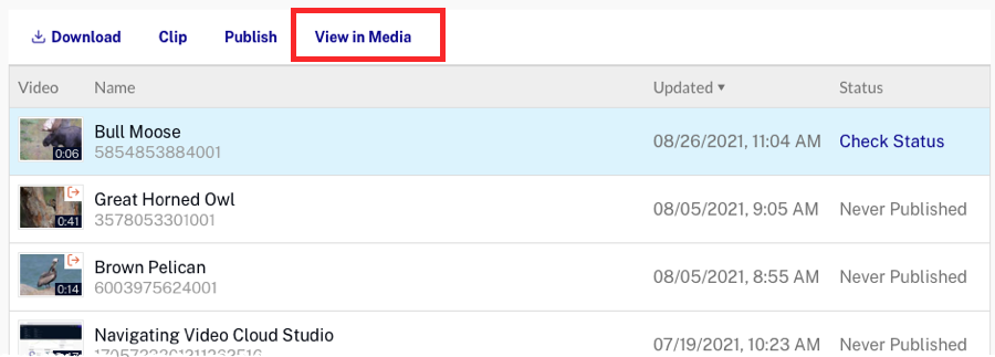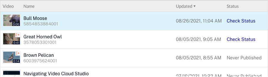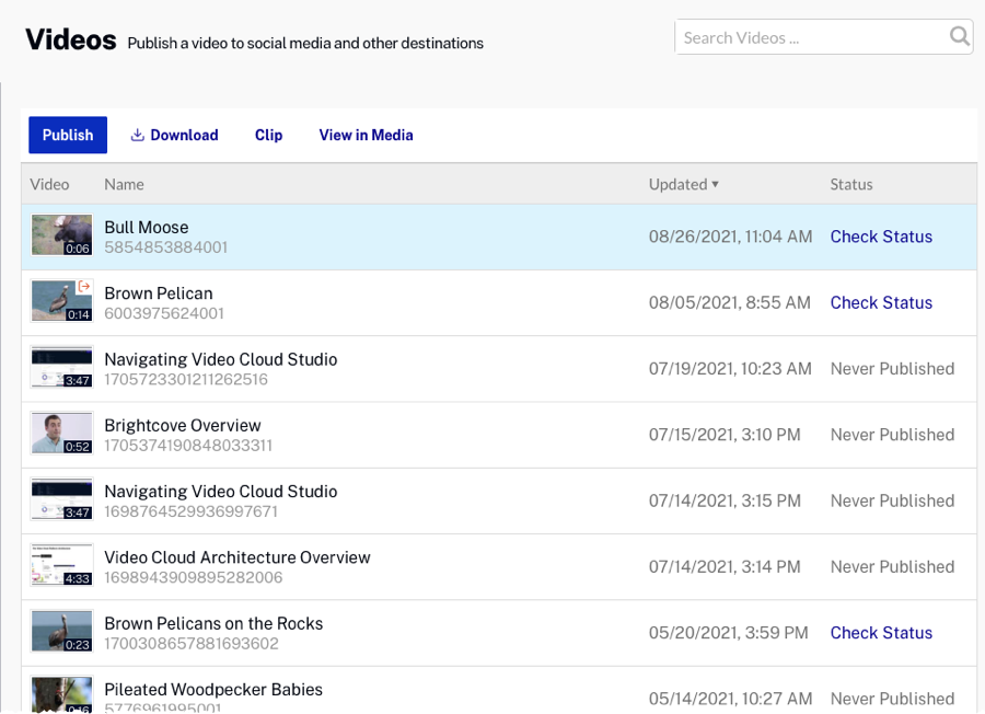 - Cliquez sur Video dans le volet de navigation de gauche. Une liste des vidéos à publier dans votre compte Video Cloud s'affiche.