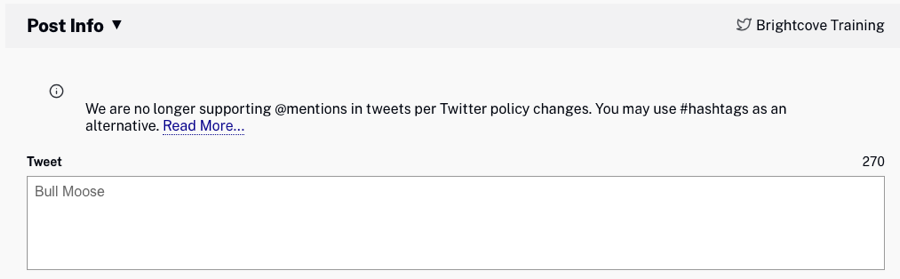 Clique sur le Informations sur la publication lien et entrez le Tweeter contenu. Notez que @mentions sera converti en #hashtags lorsqu'il sera envoyé à Twitter. Pour plus d'informations, consultez le billet de blog, Dépréciation de Twitter @mentions dans Brightcove Social.