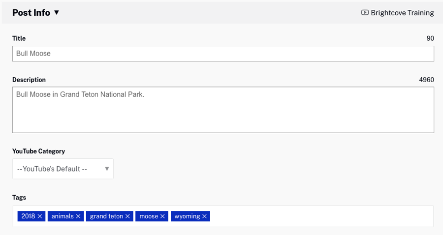 - Description : description de la vidéo (par défaut, il s'agit d'une brève description de Video Cloud). YouTube prend en charge jusqu'à 5000 caractères.