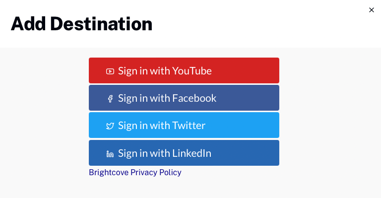 Une destination de publication est un compte/page de médias sociaux sur lequel vous souhaitez publier des vidéos Video Cloud. Avant de pouvoir publier des vidéos sur des comptes de médias sociaux à l'aide de Brightcove Social, vous devez créer au moins une destination. Des destinations peuvent être créées pour publier des vidéos sur YouTube, Facebook, Twitter et LinkedIn.