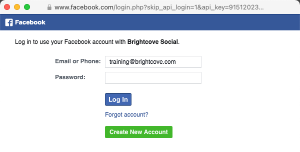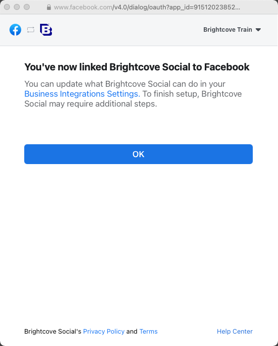 - Une boîte de dialogue s'ouvre pour confirmer que Brightcove Social est lié à Facebook. Cliquez sur d'accord.