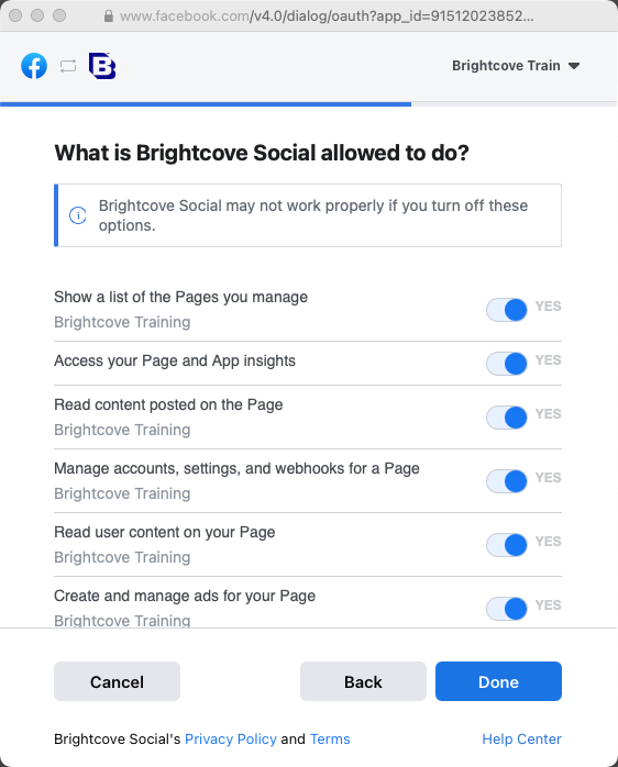 - Une boîte de dialogue s'ouvre pour confirmer ce que Brightcove Social est autorisé à faire. Modifiez les paramètres si nécessaire, puis cliquez sur Terminé.