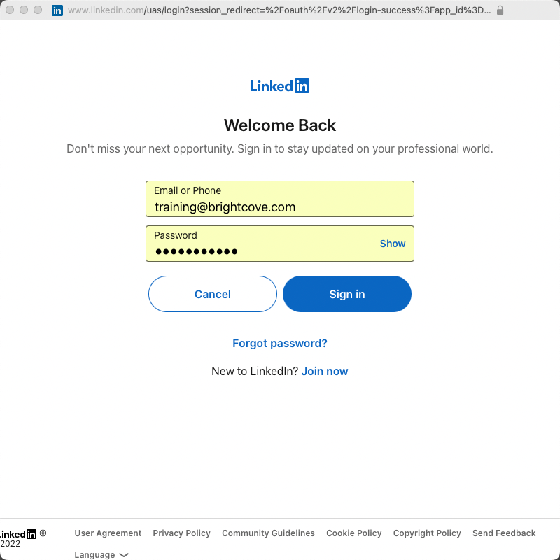 - Une boîte de dialogue s'ouvre pour vous demander de vous connecter à votre compte LinkedIn. Saisissez vos identifiants et cliquez sur Sign In.