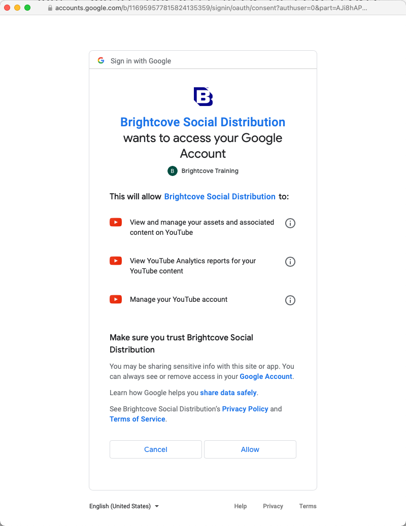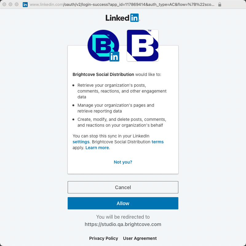 - Une boîte de dialogue s'ouvre pour confirmer ce que Brightcove Social est autorisé à faire. Cliquez sur Allow (Autoriser).