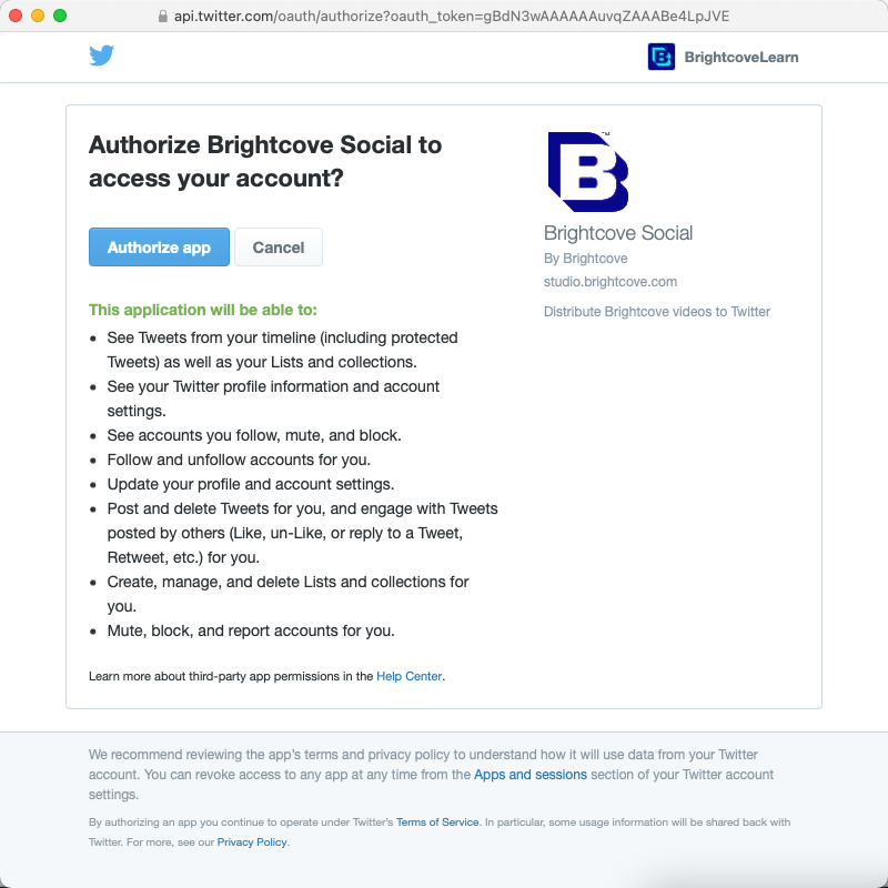 - Vous serez invité à vous connecter à votre compte Twitter et à autoriser Brightcove Social à utiliser votre compte. Connectez-vous au compte sur lequel vous souhaitez publier des vidéos. Si vous n'êtes pas invité à vous connecter, vous pouvez être connecté à un compte Twitter. Assurez-vous d'être connecté au bon compte avant de continuer. Cliquez sur Autoriser l'application.