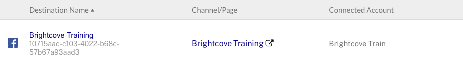 Cliquez sur le nom de la destination pour modifier la destination. Cliquez sur le lien dans la colonne Canal/Page pour ouvrir la page Facebook dans un autre onglet du navigateur.