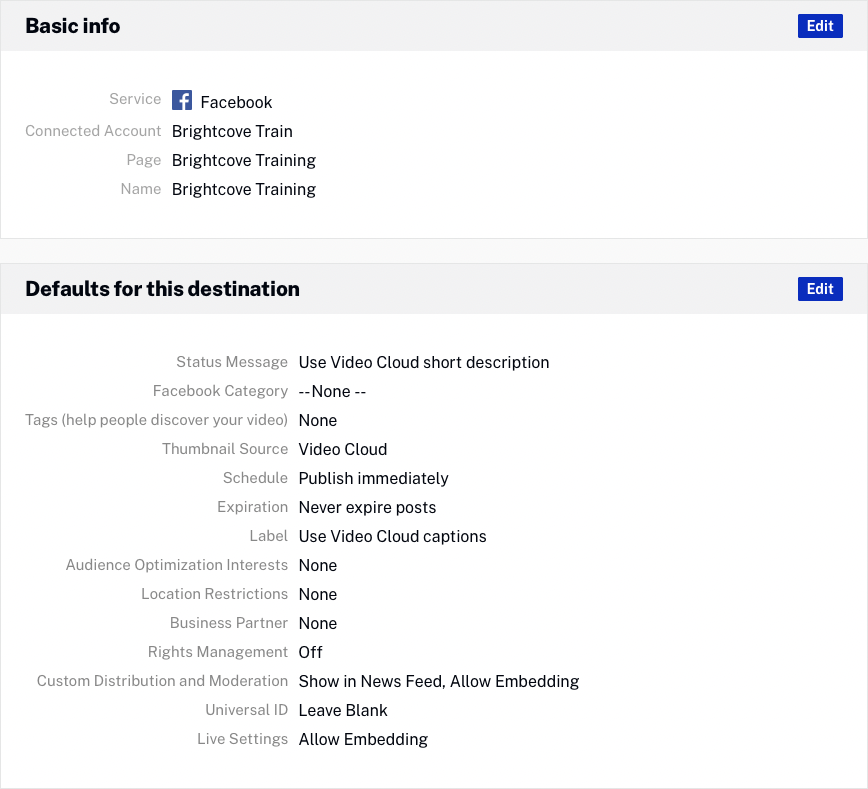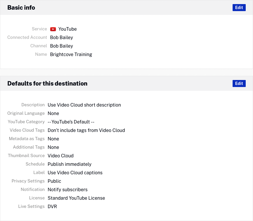 - Les informations de base et les valeurs par défaut de destination seront affichées. Cliquez sur le bouton dans la section Informations de base pour modifier le nom de la destination. Voir le Définir les paramètres par défaut de YouTube pour plus d'informations sur la configuration des valeurs par défaut.