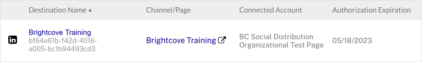 Cliquez sur le nom de la destination pour modifier la destination. Cliquez sur le lien dans la colonne Canal/Page pour ouvrir la page LinkedIn dans un autre onglet du navigateur.