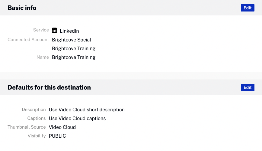 Les valeurs par défaut de destination seront utilisées comme propriétés vidéo par défaut lors de la publication de vidéos sur les plates-formes sociales. Pour configurer les paramètres de publication par défaut pour les destinations LinkedIn, cliquez sur le nom de la destination, puis sur dans le Valeurs par défaut pour cette destination section. Les propriétés vidéo LinkedIn suivantes peuvent être configurées :