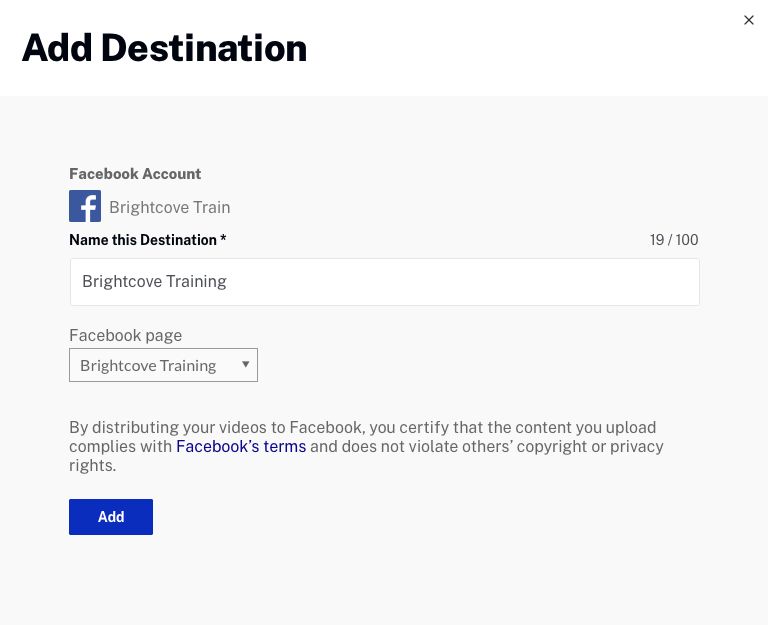Créez une destination Facebook lorsque vous souhaitez publier des vidéos sur une page Facebook. Notez que les vidéos ne peuvent être distribuées qu'aux pages Facebook, pas aux pages de profil personnel. Pour créer une destination Facebook, procédez comme suit.
