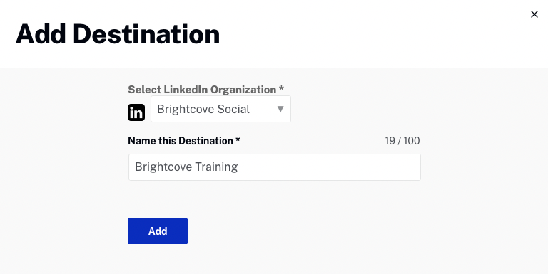 - Donnez à la destination un nom descriptif unique. Si vous avez plusieurs organisations LinkedIn, sélectionnez la page sur laquelle publier à l'aide de la liste déroulante, puis cliquez sur .