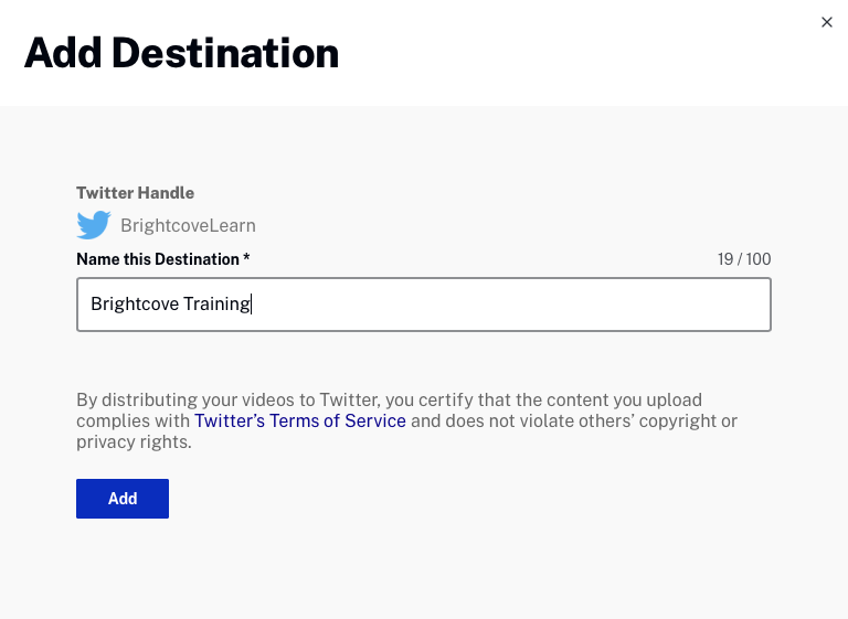Créez une destination Twitter lorsque vous souhaitez publier des vidéos sur un flux Twitter. Pour créer une destination Twitter, procédez comme suit.
