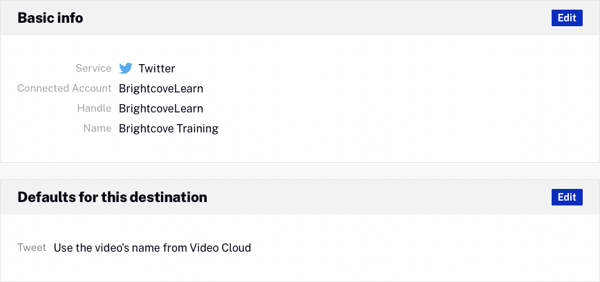 - Les informations de base et les valeurs par défaut de destination seront affichées. Cliquez sur dans la section Informations de base pour modifier le nom de la destination. Voir le Définir les valeurs par défaut de Twitter pour plus d'informations sur la configuration des valeurs par défaut.
