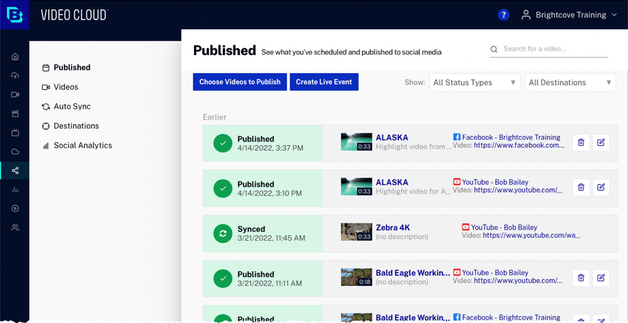 Pour afficher vos vidéos publiées, cliquez sur le lien Published dans la navigation de gauche. Chaque vidéo publiée affichera l'état de publication, les informations vidéo et un lien vers la plateforme sociale sur laquelle la vidéo a été publiée. Pour plus d'informations sur la visualisation des vidéos publiées, reportez-vous à la section Affichage des vidéos publiées sur les réseaux sociaux.
