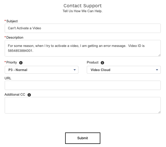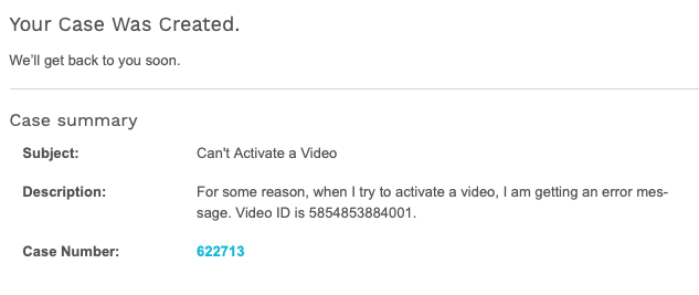 L'une des options de support est le portail de support qui peut être utilisé pour ouvrir un dossier avec Brightcove Support.