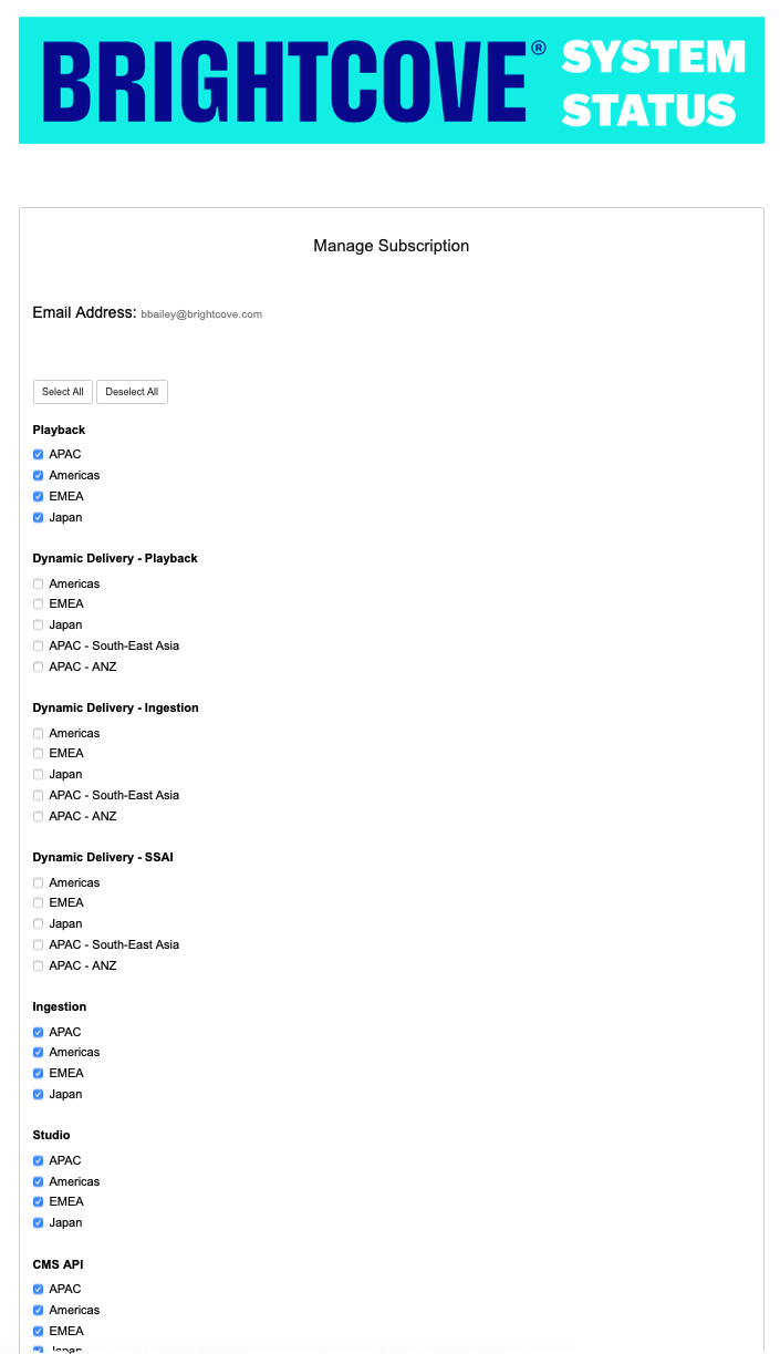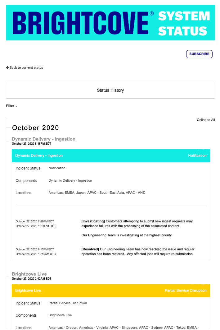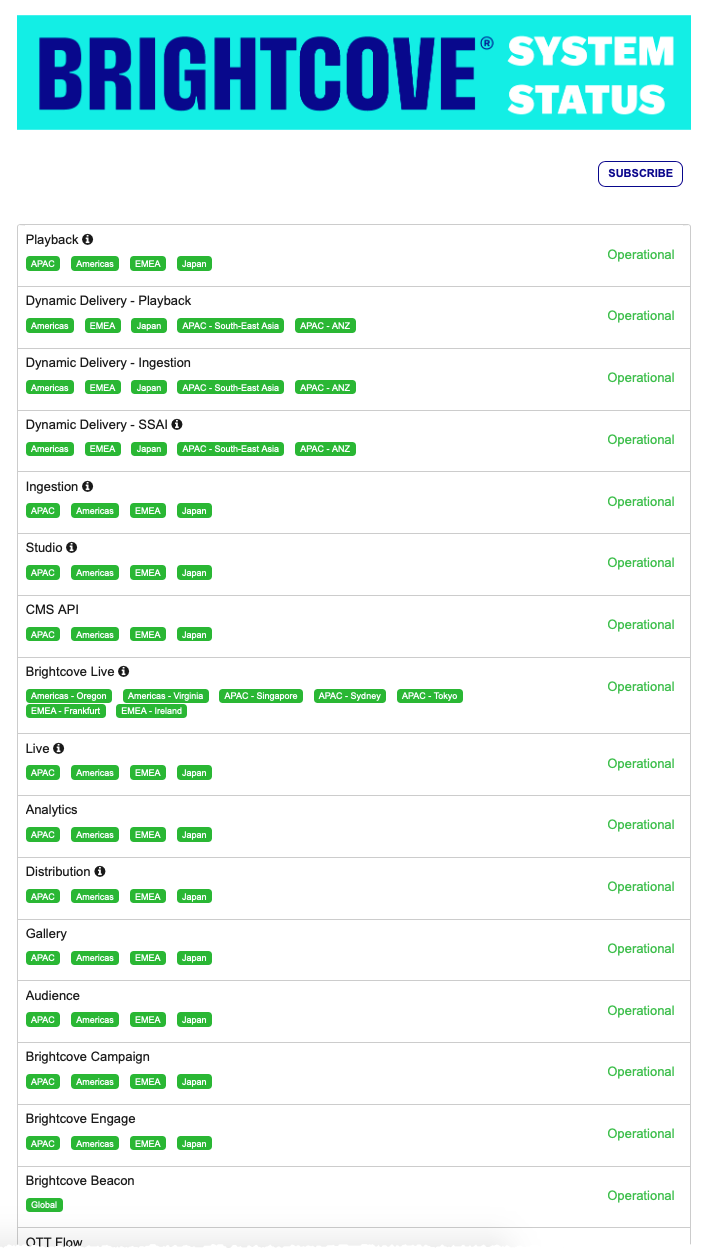 Brightcove surveille en permanence l'état de tous les services et applications Brightcove. En cas d'interruption d'un service, une note est publiée sur la page d'état du système. Tous les avis de maintenance programmée seront également affichés sur cette page.