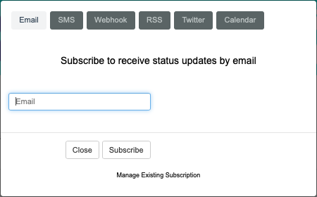 Pour vous inscrire et être averti lorsque l'état du système change, sélectionnez le S'ABONNER bouton. Saisissez ensuite une URL pour recevoir la charge utile JSON avec votre adresse e-mail.